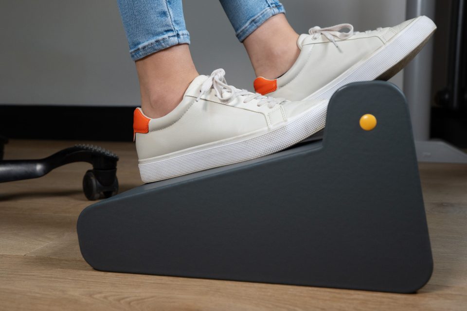 A robust, adjustable footrest designed to support healthier posture throughout the working day